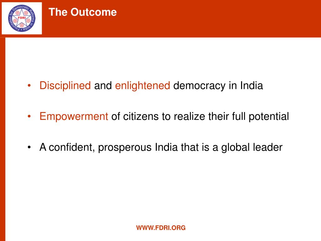 The Outcome • Disciplined and enlightened democracy in India • Empowerment of citizens to realize their full potential • A confident, prosperous India that is a global leader WWW.FDRI.ORG