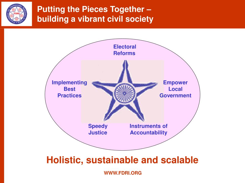 Putting the Pieces Together – building a vibrant civil society Electoral Reforms Implementing Best Practices Empower Local Government Speedy Justice Instruments of Accountability Holistic, sustainable and scalable WWW.FDRI.ORG