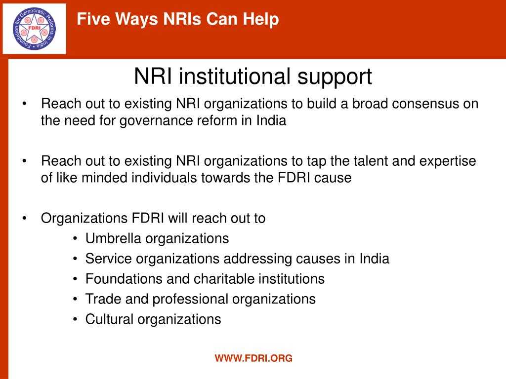 Five Ways NRIs Can Help • Reach out to existing NRI organizations to build a broad consensus on the need for governance reform in India • Reach out to existing NRI organizations to tap the talent and expertise of like minded individuals towards the FDRI cause • Organizations FDRI will reach out to • Umbrella organizations • Service organizations addressing causes in India • Foundations and charitable institutions • Trade and professional organizations • Cultural organizations NRI institutional support WWW.FDRI.ORG