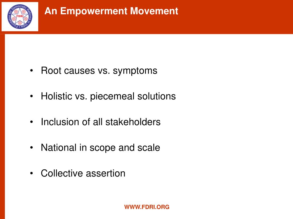 An Empowerment Movement • Root causes vs. symptoms • Holistic vs. piecemeal solutions • Inclusion of all stakeholders • National in scope and scale • Collective assertion WWW.FDRI.ORG