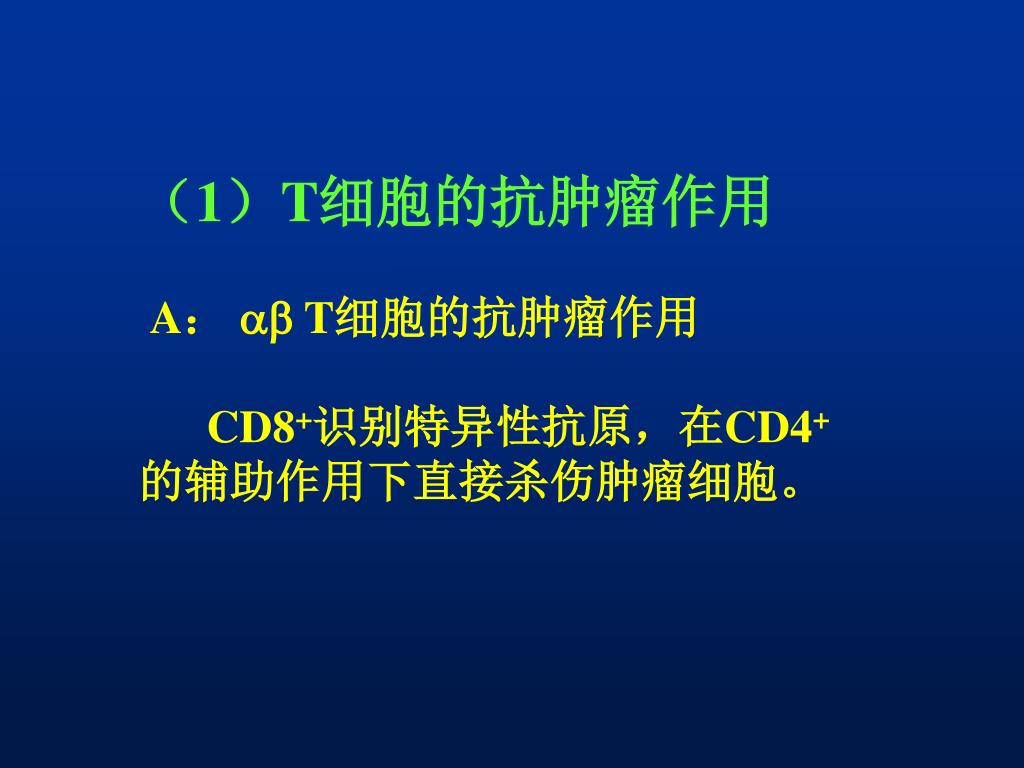 (1)T细胞的抗肿瘤作用 A: T细胞的抗肿瘤作用 CD8+识别特异性抗原,在CD4+的辅助作用下直接杀伤肿瘤细胞。