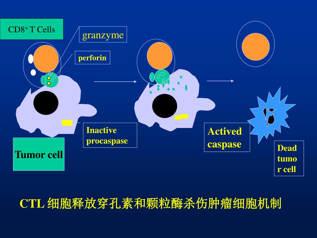 T cell perforin Inactive procaspase Actived caspase Tumor cell Dead tumor cell CD8+ T Cells granzyme CTL 细胞释放穿孔素和颗粒酶杀伤肿瘤细胞机制