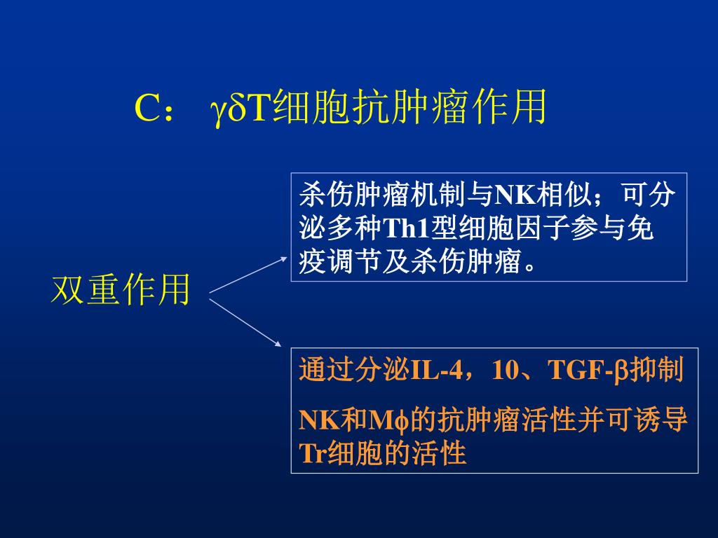 C: T细胞抗肿瘤作用 杀伤肿瘤机制与NK相似;可分泌多种Th1型细胞因子参与免疫调节及杀伤肿瘤。 双重作用 通过分泌IL-4,10、TGF-抑制 NK和M的抗肿瘤活性并可诱导Tr细胞的活性