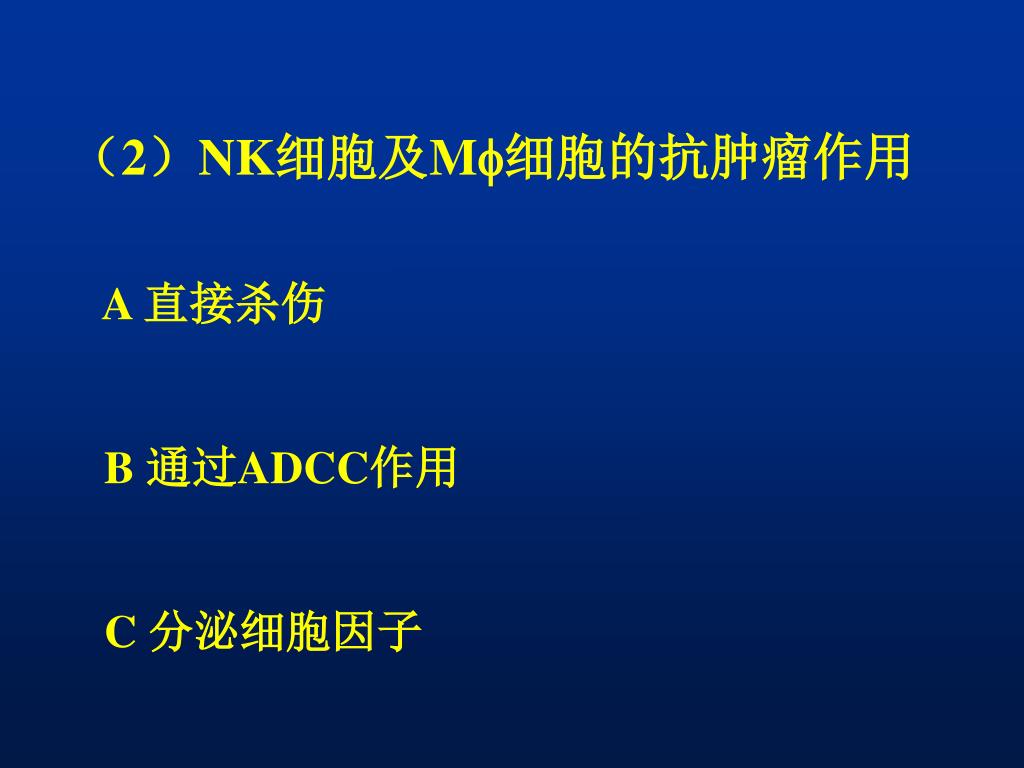 (2)NK细胞及M细胞的抗肿瘤作用 A 直接杀伤 B 通过ADCC作用 C 分泌细胞因子