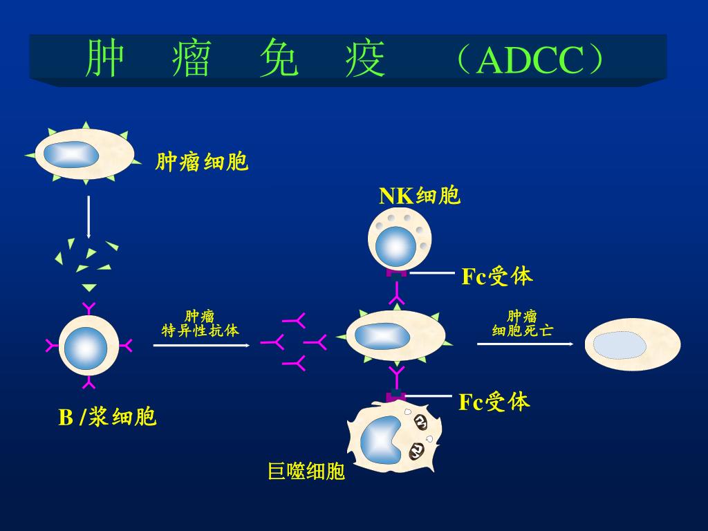 肿 瘤 免 疫(ADCC) 肿瘤细胞 NK细胞 Fc受体 肿瘤 特异性抗体 肿瘤 细胞死亡 Fc受体 B /浆细胞 巨噬细胞