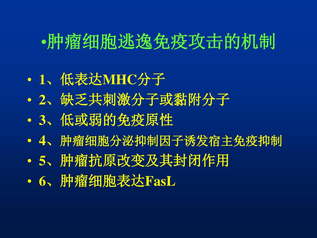肿瘤细胞逃逸免疫攻击的机制 • 1、低表达MHC分子 • 2、缺乏共刺激分子或黏附分子 • 3、低或弱的免疫原性 • 4、肿瘤细胞分泌抑制因子诱发宿主免疫抑制 • 5、肿瘤抗原改变及其封闭作用 • 6、肿瘤细胞表达FasL
