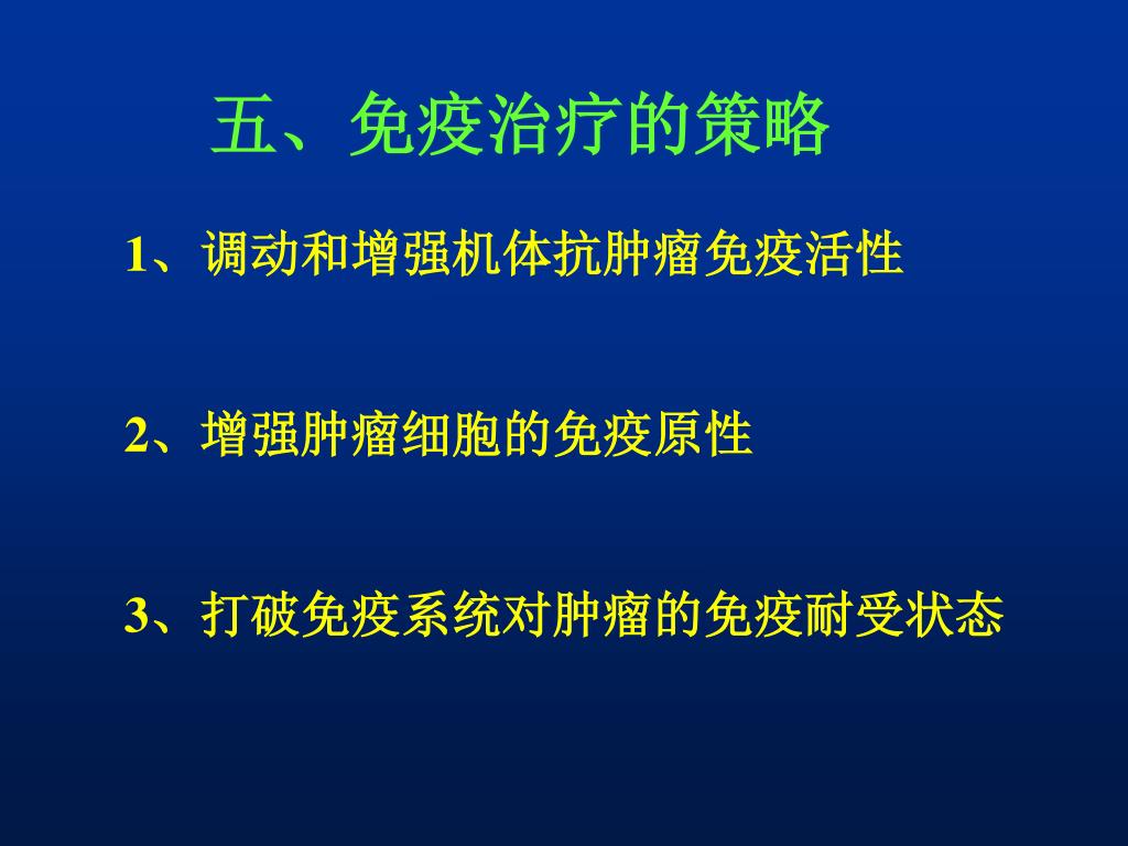 五、免疫治疗的策略 1、调动和增强机体抗肿瘤免疫活性 2、增强肿瘤细胞的免疫原性 3、打破免疫系统对肿瘤的免疫耐受状态