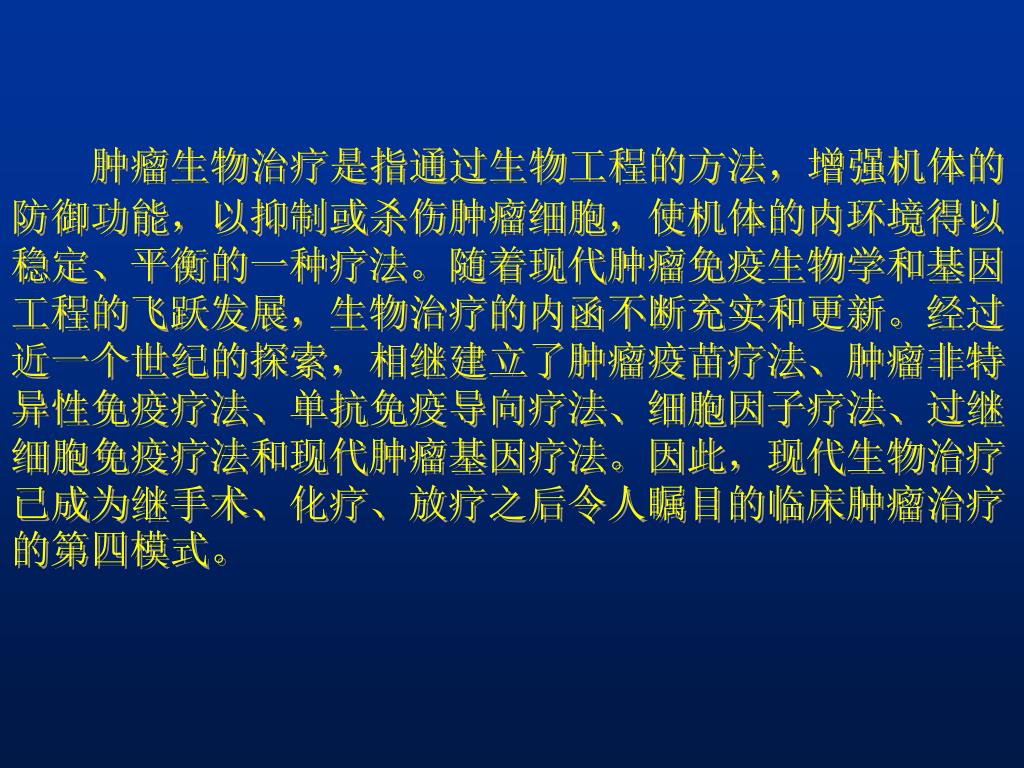 肿瘤生物治疗是指通过生物工程的方法,增强机体的防御功能,以抑制或杀伤肿瘤细胞,使机体的内环境得以稳定、平衡的一种疗法。随着现代肿瘤免疫生物学和基因工程的飞跃发展,生物治疗的内函不断充实和更新。经过近一个世纪的探索,相继建立了肿瘤疫苗疗法、肿瘤非特异性免疫疗法、单抗免疫导向疗法、细胞因子疗法、过继细胞免疫疗法和现代肿瘤基因疗法。因此,现代生物治疗已成为继手术、化疗、放疗之后令人瞩目的临床肿瘤治疗的第四模式。肿瘤生物治疗是指通过生物工程的方法,增强机体的防御功能,以抑制或杀伤肿瘤细胞,使机体的内环境得以稳定、平衡的一种疗法。随着现代肿瘤免疫生物学和基因工程的飞跃发展,生物治疗的内函不断充实和更新。经过近一个世纪的探索,相继建立了肿瘤疫苗疗法、肿瘤非特异性免疫疗法、单抗免疫导向疗法、细胞因子疗法、过继细胞免疫疗法和现代肿瘤基因疗法。因此,现代生物治疗已成为继手术、化疗、放疗之后令人瞩目的临床肿瘤治疗的第四模式。