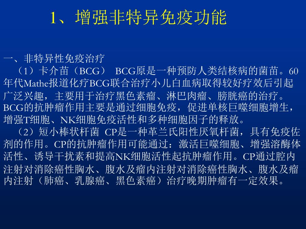 1、增强非特异免疫功能 一、非特异性免疫治疗 (1)卡介苗(BCG) BCG原是一种预防人类结核病的菌苗。60年代Mathe报道化疗BCG联合治疗小儿白血病取得较好疗效后引起广泛兴趣,主要用于治疗黑色素瘤、淋巴肉瘤、膀胱癌的治疗。BCG的抗肿瘤作用主要是通过细胞免疫,促进单核巨噬细胞增生,增强T细胞、NK细胞免疫活性和多种细胞因子的释放。 (2)短小棒状杆菌 CP是一种革兰氏阳性厌氧杆菌,具有免疫佐剂的作用。CP的抗肿瘤作用可能通过:激活巨噬细胞、增强溶酶体活性、诱导干扰素和提高NK细胞活性起抗肿瘤作用。CP通过腔内注射对消除癌性胸水、腹水及瘤内注射对消除癌性胸水、腹水及瘤内注射(肺癌、乳腺癌、黑色素癌)治疗晚期肿瘤有一定效果。