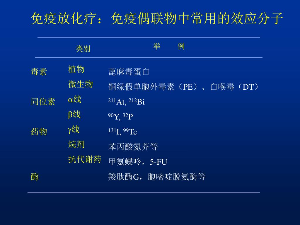 免疫放化疗:免疫偶联物中常用的效应分子 举 例 类别 植物 微生物 线 线 线 烷剂 抗代谢药 毒素 同位素 药物 酶 蓖麻毒蛋白 铜绿假单胞外毒素(PE)、白喉毒(DT) 211At, 212Bi 90Y, 32P 131I, 99Tc 苯丙酸氮芥等 甲氨蝶呤,5-FU 羧肽酶G,胞嘧啶脱氨酶等