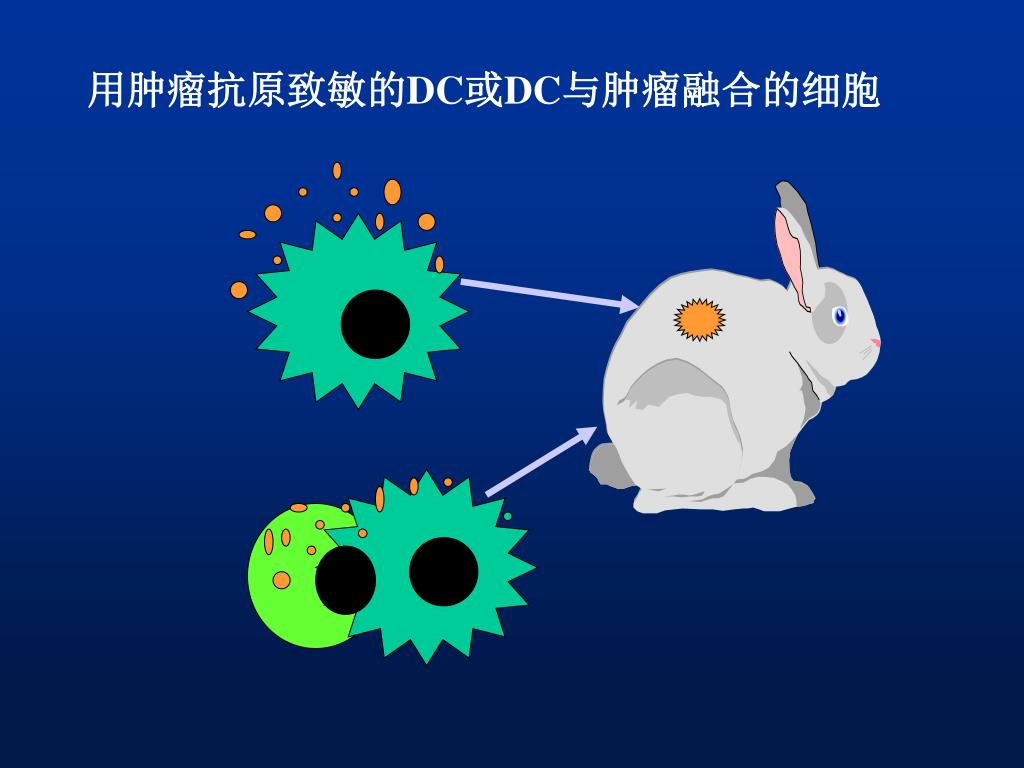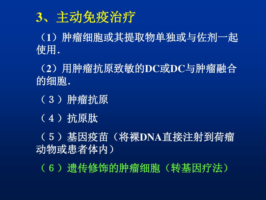 3、主动免疫治疗 (1)肿瘤细胞或其提取物单独或与佐剂一起使用. (2)用肿瘤抗原致敏的DC或DC与肿瘤融合的细胞. (3)肿瘤抗原 (4)抗原肽 (5)基因疫苗(将裸DNA直接注射到荷瘤动物或患者体内) (6)遗传修饰的肿瘤细胞(转基因疗法)