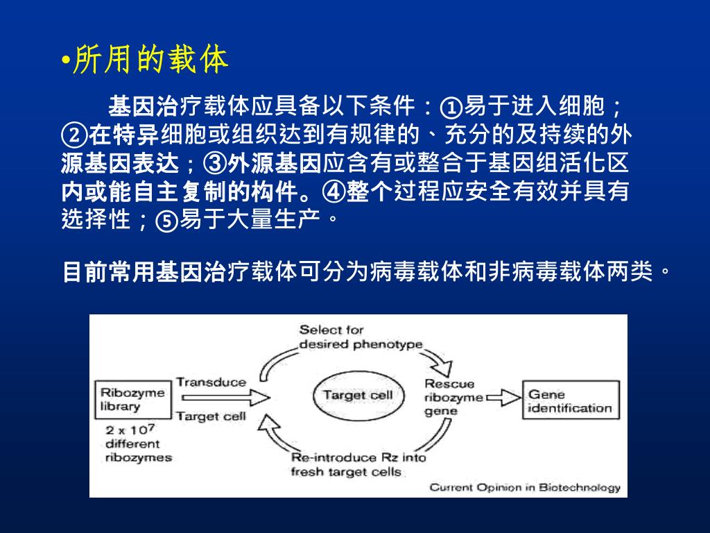 所用的载体 • 基因治疗载体应具备以下条件:①易于进入细胞;②在特异细胞或组织达到有规律的、充分的及持续的外源基因表达;③外源基因应含有或整合于基因组活化区内或能自主复制的构件。④整个过程应安全有效并具有选择性;⑤易于大量生产。 目前常用基因治疗载体可分为病毒载体和非病毒载体两类。
