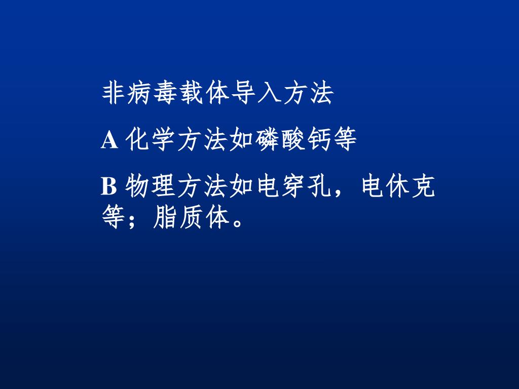 非病毒载体导入方法 A 化学方法如磷酸钙等 B 物理方法如电穿孔,电休克等;脂质体。