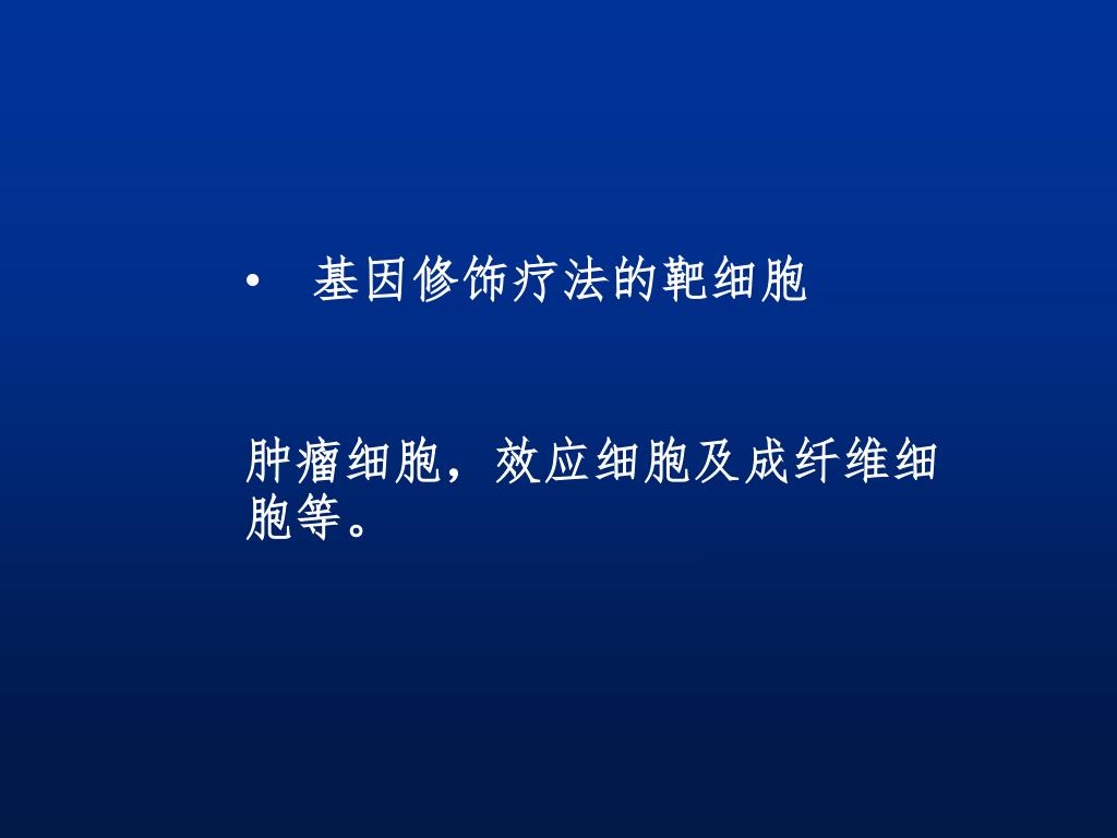 基因修饰疗法的靶细胞 • 肿瘤细胞,效应细胞及成纤维细胞等。