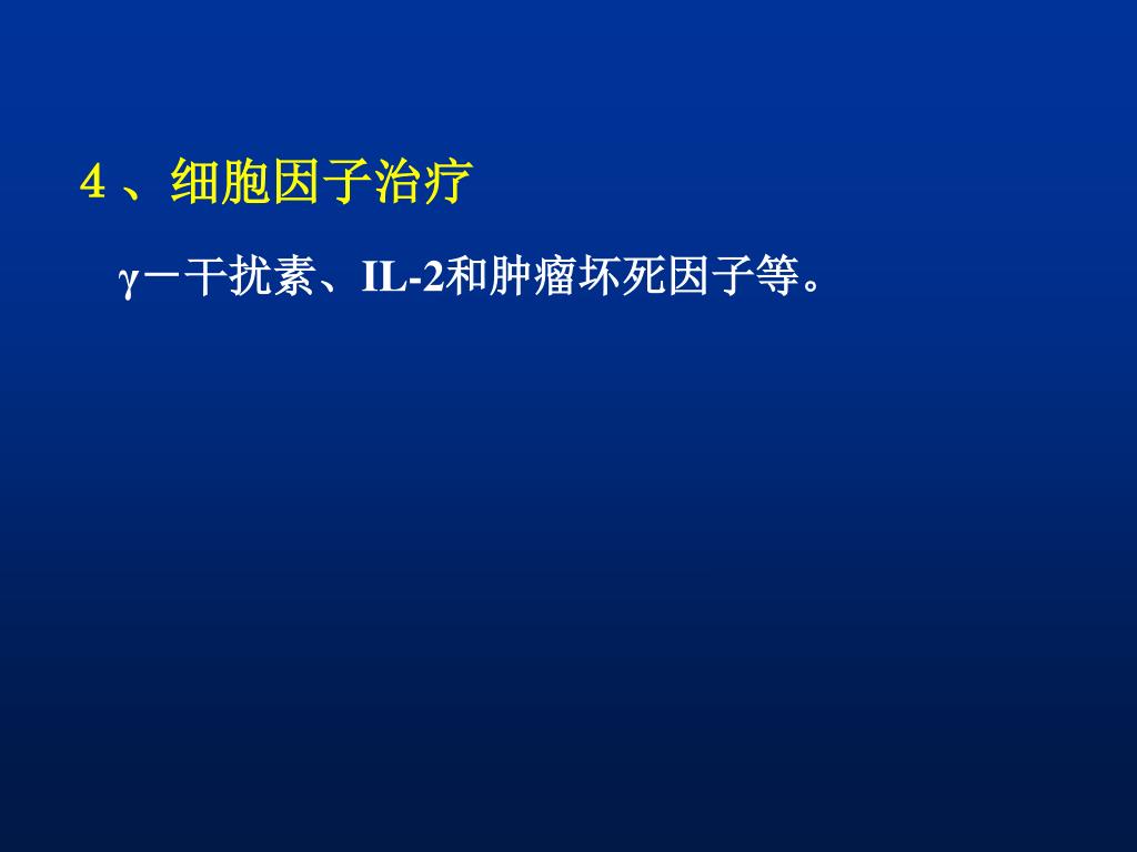 4、细胞因子治疗 γ-干扰素、IL-2和肿瘤坏死因子等。