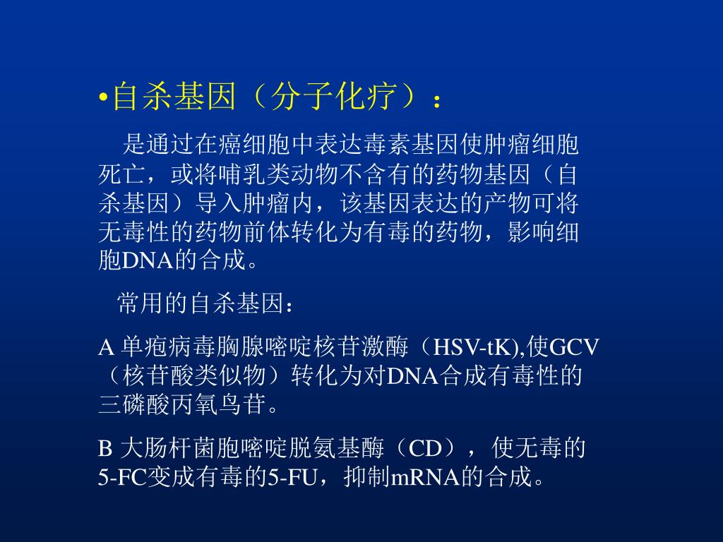 自杀基因(分子化疗): • 是通过在癌细胞中表达毒素基因使肿瘤细胞死亡,或将哺乳类动物不含有的药物基因(自杀基因)导入肿瘤内,该基因表达的产物可将无毒性的药物前体转化为有毒的药物,影响细胞DNA的合成。 • 常用的自杀基因: • A 单疱病毒胸腺嘧啶核苷激酶(HSV-tK),使GCV(核苷酸类似物)转化为对DNA合成有毒性的三磷酸丙氧鸟苷。 • B 大肠杆菌胞嘧啶脱氨基酶(CD),使无毒的5-FC变成有毒的5-FU,抑制mRNA的合成。