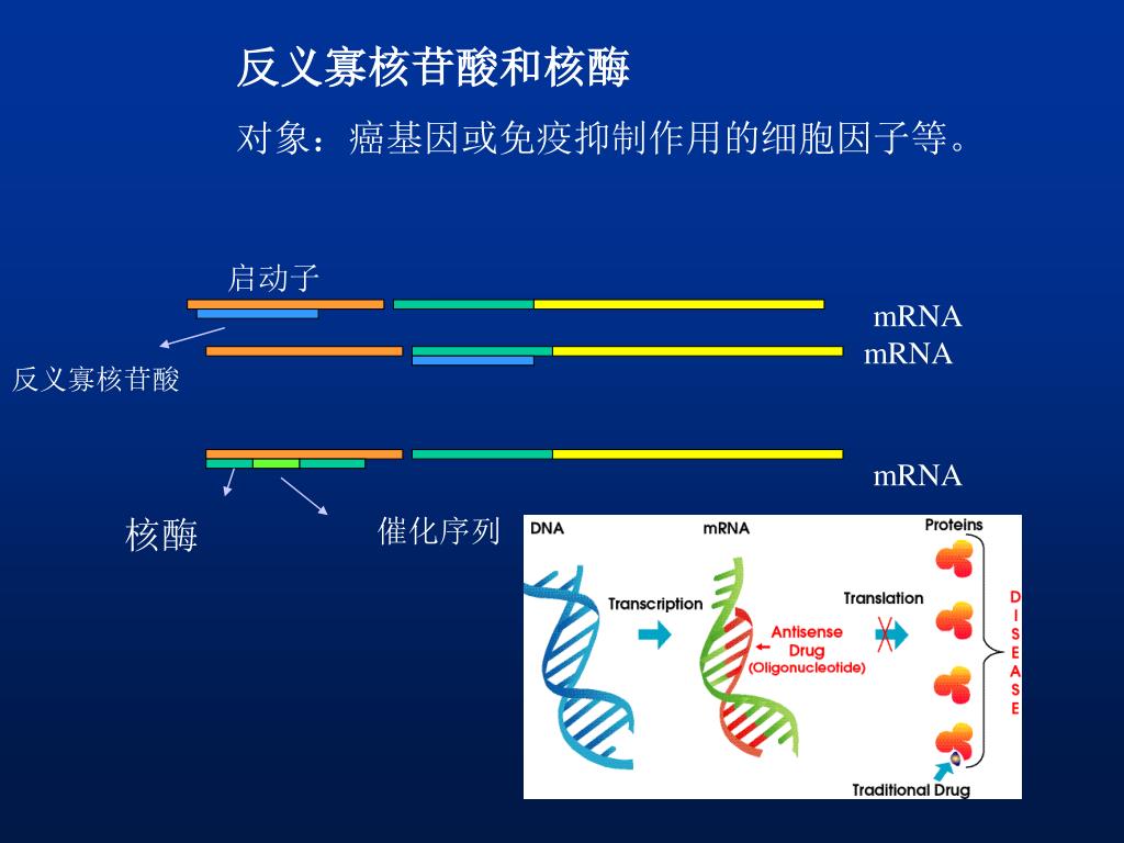 反义寡核苷酸和核酶 对象:癌基因或免疫抑制作用的细胞因子等。 启动子 mRNA mRNA 反义寡核苷酸 mRNA 核酶 催化序列