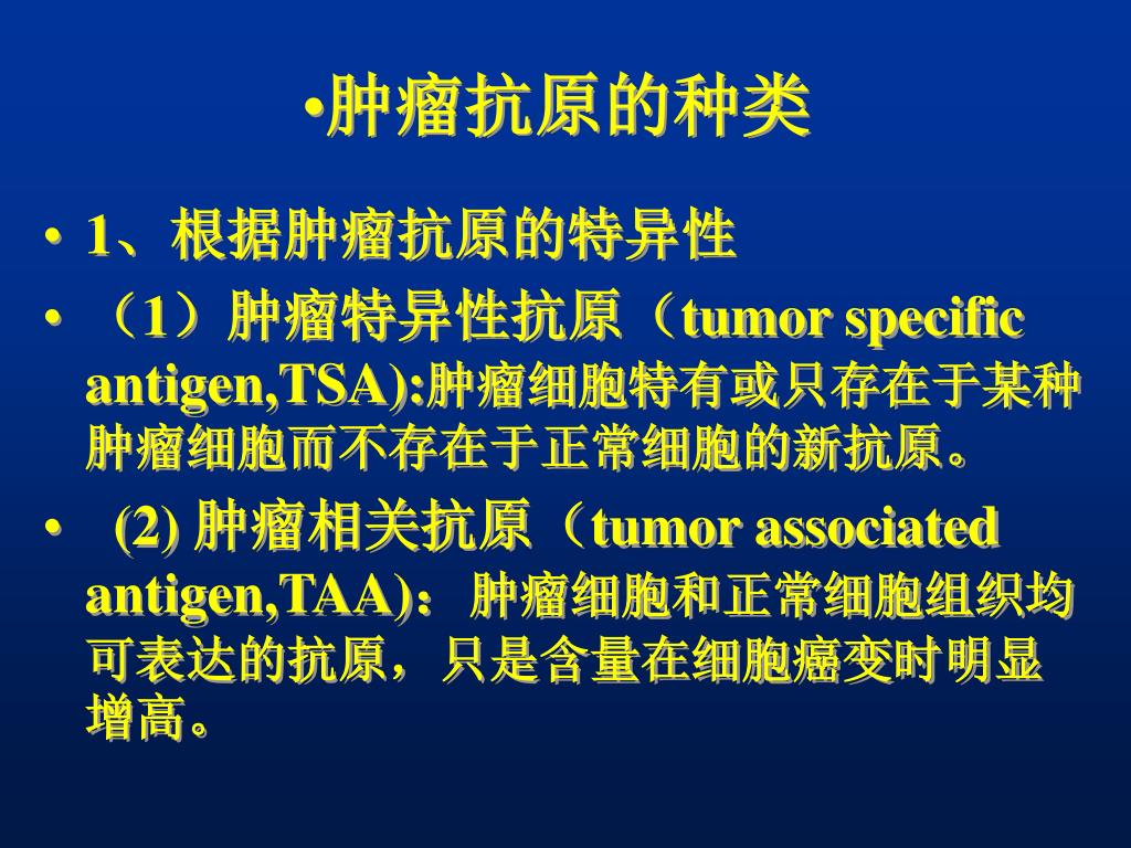 肿瘤抗原的种类 • 1、根据肿瘤抗原的特异性 • (1)肿瘤特异性抗原(tumor specific antigen,TSA):肿瘤细胞特有或只存在于某种肿瘤细胞而不存在于正常细胞的新抗原。 • (2) 肿瘤相关抗原(tumor associated antigen,TAA):肿瘤细胞和正常细胞组织均可表达的抗原,只是含量在细胞癌变时明显增高。