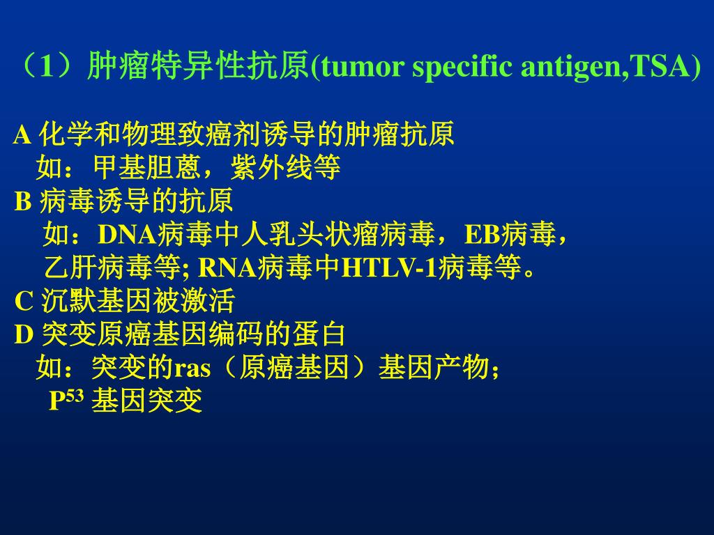 (1)肿瘤特异性抗原(tumor specific antigen,TSA) A 化学和物理致癌剂诱导的肿瘤抗原 如:甲基胆蒽,紫外线等 B 病毒诱导的抗原 如:DNA病毒中人乳头状瘤病毒,EB病毒, 乙肝病毒等; RNA病毒中HTLV-1病毒等。 C 沉默基因被激活 D 突变原癌基因编码的蛋白 如:突变的ras(原癌基因)基因产物; P53基因突变