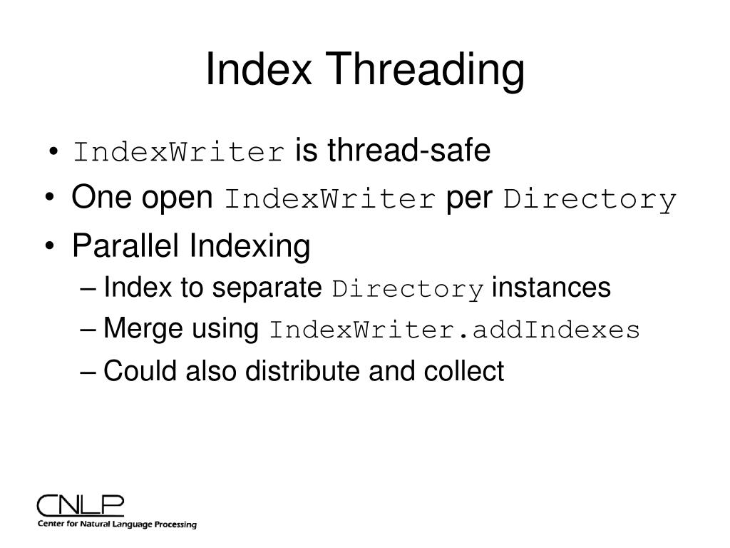 Index Threading • IndexWriter is thread-safe • One open IndexWriter per Directory • Parallel Indexing • Index to separate Directory instances • Merge using IndexWriter.addIndexes • Could also distribute and collect