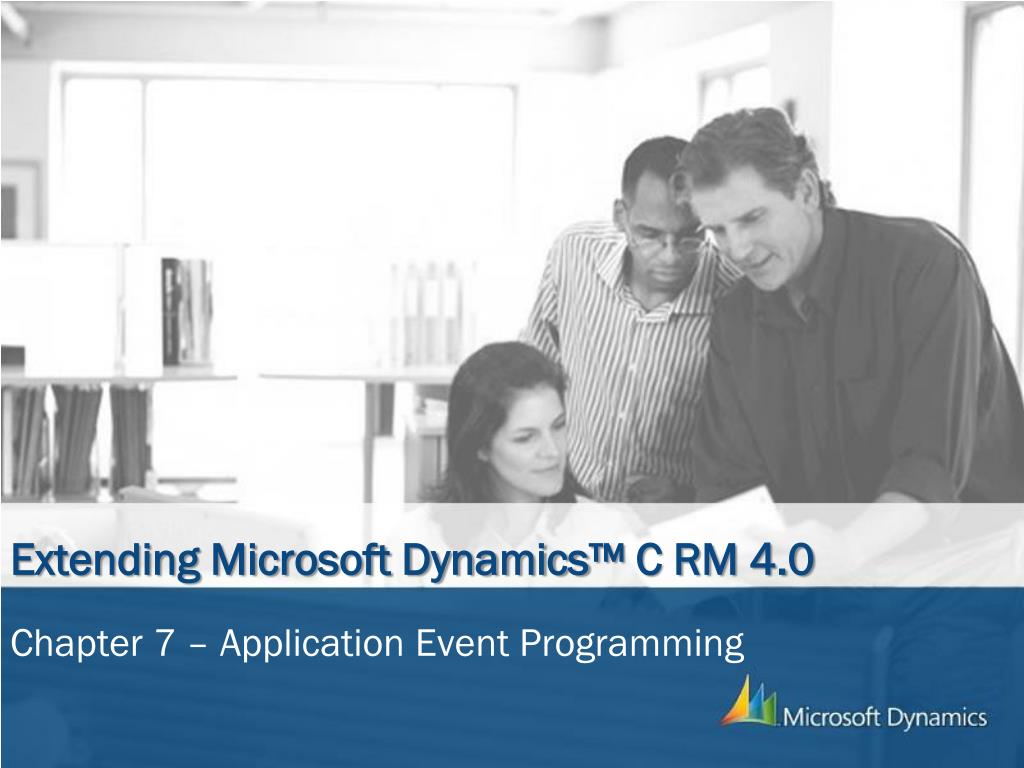 Extending Microsoft Dynamics™ C RM 4.0. Chapter 7 – Application Event Programming. Overview. Use form and field events. Reference Microsoft Dynamics CRM form values. Set event dependencies. Apply best practices when writing client-side code. Debug client-side code.