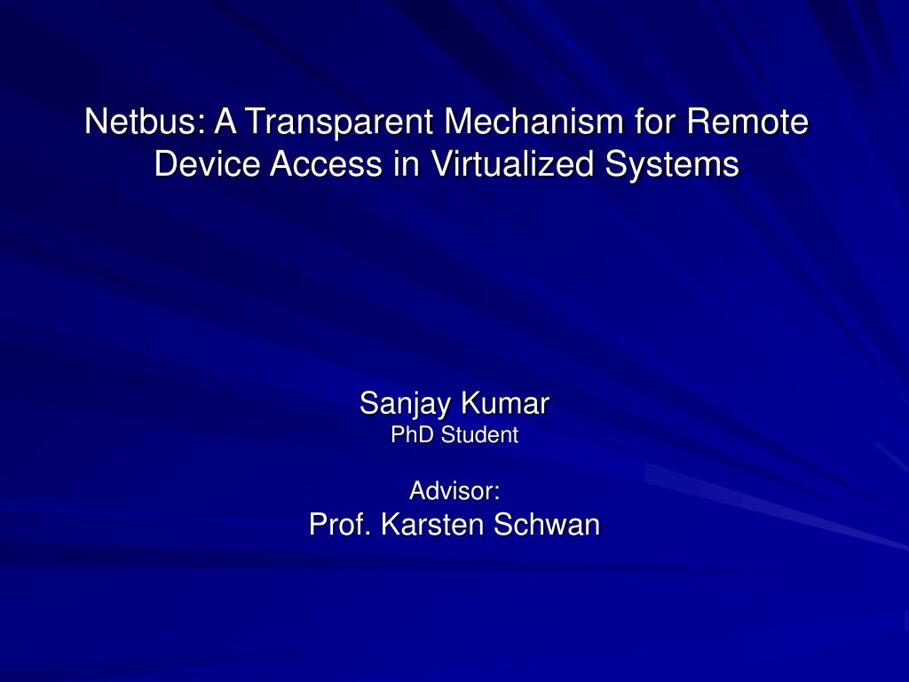 Netbus: A Transparent Mechanism for Remote Device Access in Virtualized Systems Sanjay Kumar PhD Student Advisor: Prof. Karsten Schwan