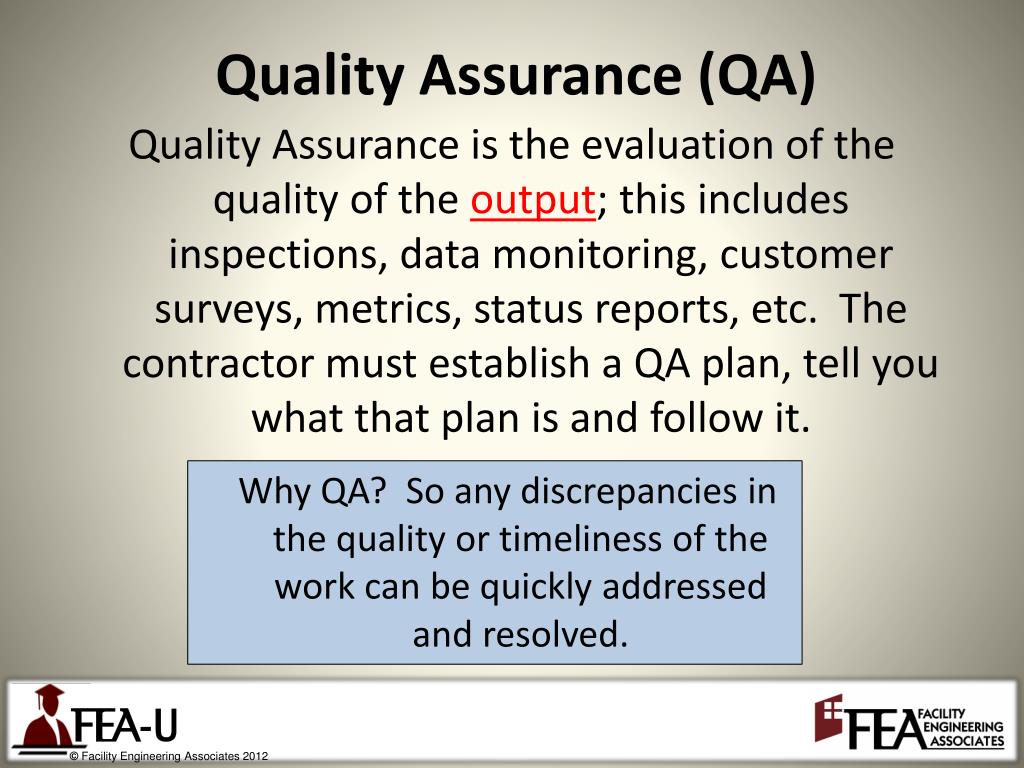 Quality Assurance (QA) Quality Assurance is the evaluation of the quality of the output; this includes inspections, data monitoring, customer surveys, metrics, status reports, etc. The contractor must establish a QA plan, tell you what that plan is and follow it. Why QA? So any discrepancies in the quality or timeliness of the work can be quickly addressed and resolved.