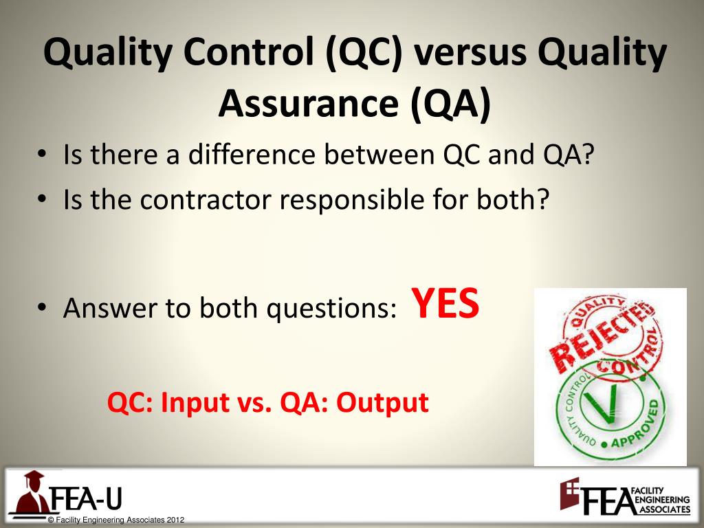 Quality Control (QC) versus Quality Assurance (QA) • Is there a difference between QC and QA? • Is the contractor responsible for both? • Answer to both questions: YES QC: Input vs. QA: Output