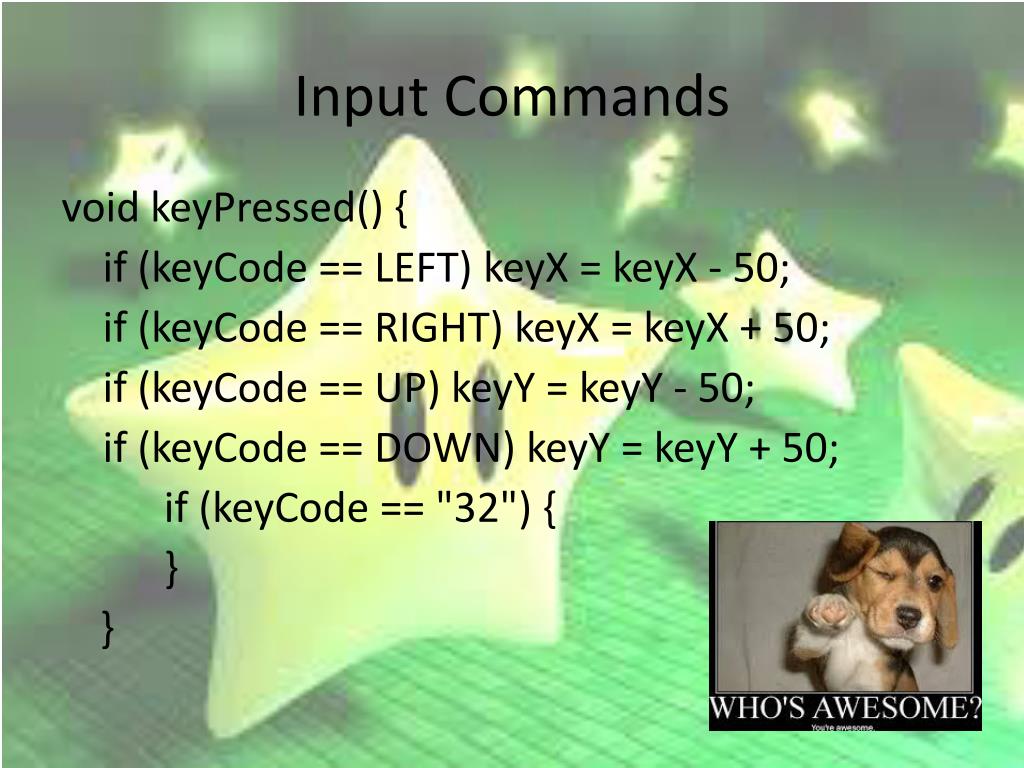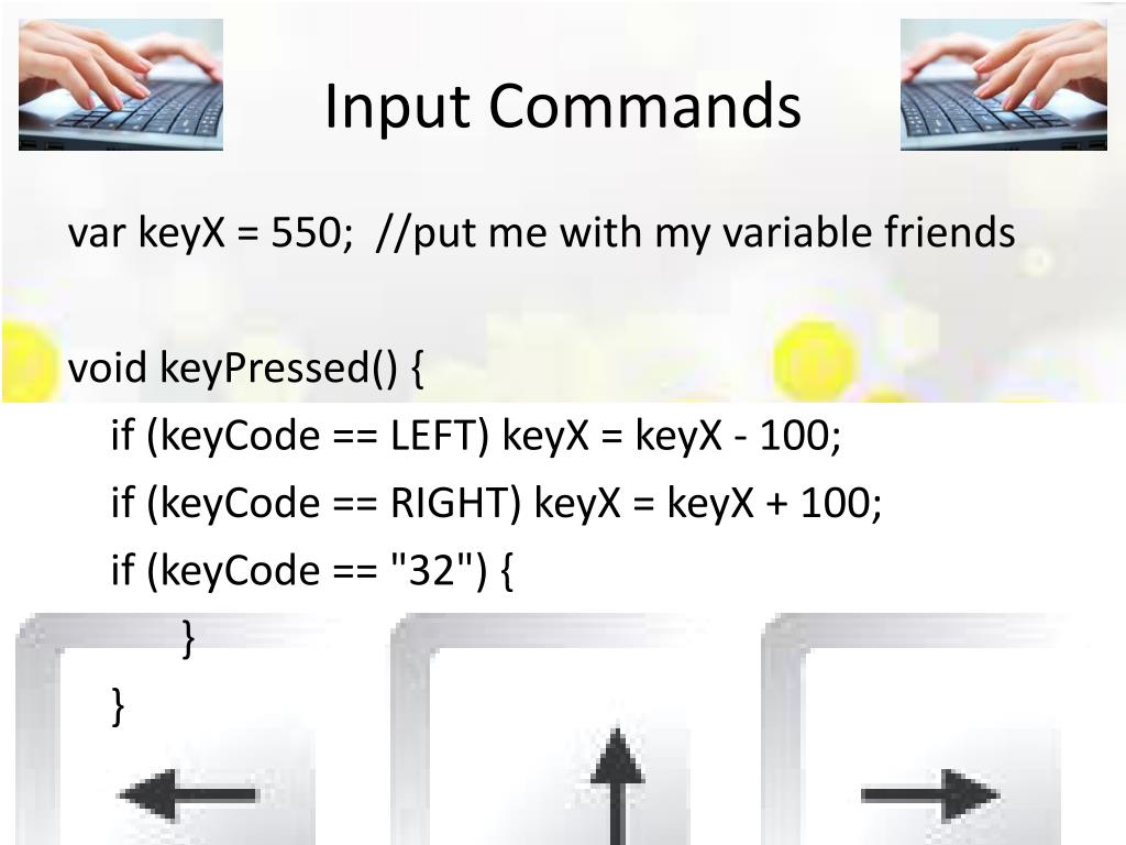 Input Commands varkeyX = 550; //put me with my variable friends void keyPressed() { if (keyCode == LEFT) keyX = keyX - 100; if (keyCode == RIGHT) keyX = keyX + 100; if (keyCode == "32") { } }