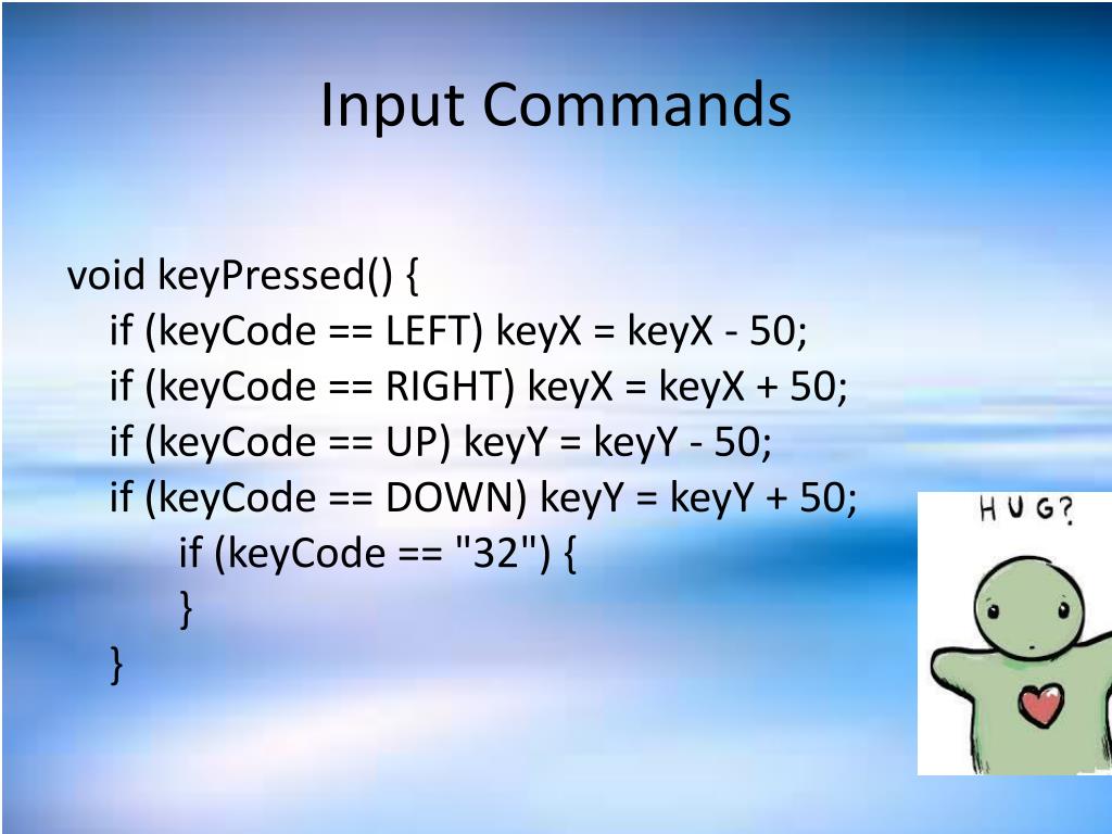 Input Commands void keyPressed() { if (keyCode == LEFT) keyX = keyX - 50; if (keyCode == RIGHT) keyX = keyX + 50; if (keyCode == UP) keyY = keyY - 50; if (keyCode == DOWN) keyY = keyY + 50; if (keyCode == "32") { } }
