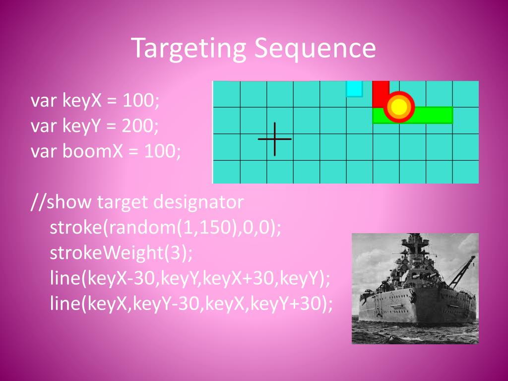 Targeting Sequence varkeyX = 100; varkeyY = 200; varboomX = 100; //show target designator stroke(random(1,150),0,0); strokeWeight(3); line(keyX-30,keyY,keyX+30,keyY); line(keyX,keyY-30,keyX,keyY+30);
