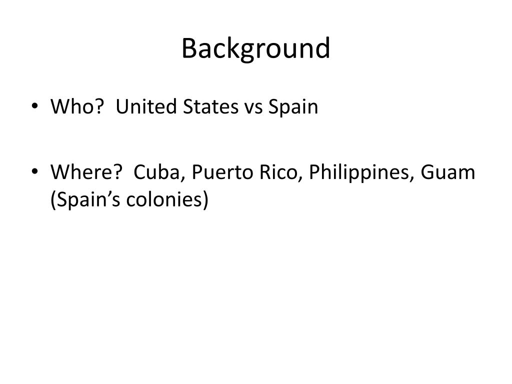 Background • Who? United States vs Spain • Where? Cuba, Puerto Rico, Philippines, Guam (Spain’s colonies)