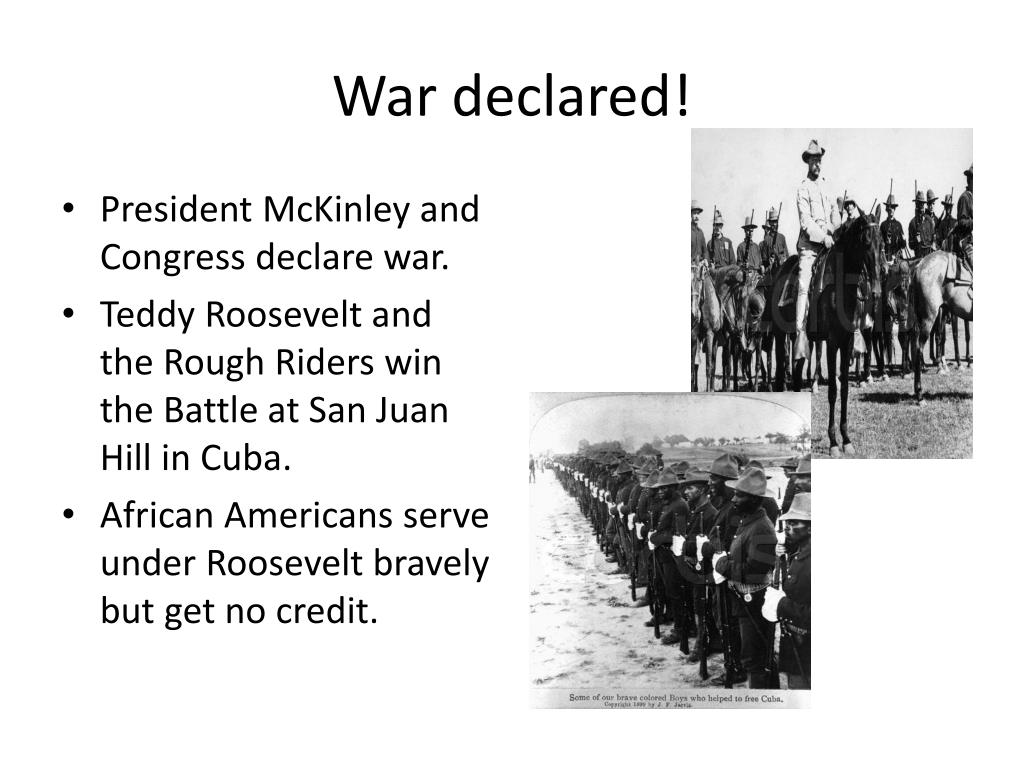 War declared! • President McKinley and Congress declare war. • Teddy Roosevelt and the Rough Riders win the Battle at San Juan Hill in Cuba. • African Americans serve under Roosevelt bravely but get no credit.