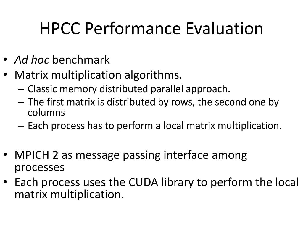 HPCC Performance Evaluation • Ad hoc benchmark • Matrix multiplication algorithms. • Classic memory distributed parallel approach. • The first matrix is distributed by rows, the second one by columns • Each process has to perform a local matrix multiplication. • MPICH 2 as message passing interface among processes • Each process uses the CUDA library to perform the local matrix multiplication.