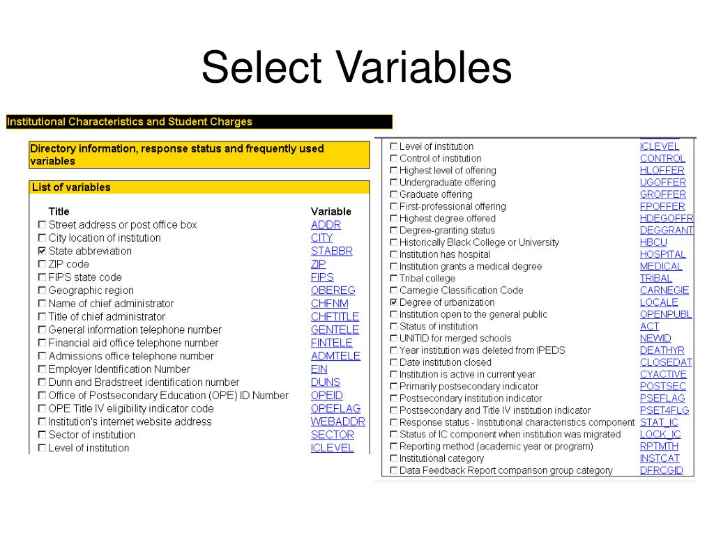 Dataset Cutting Tool (DCT) For one data year: • download entire IPEDS data files • Custom-build large datasets, selecting mix of schools, surveys, variables • Download datasets for analysis off-line using Excel, SPSS, SAS, or STATA • Peer Analysis System (PAS) With selected schools & variables: • rank schools by variable • calculate new variables • create standard and custom reports • View/download data, reports, graphs