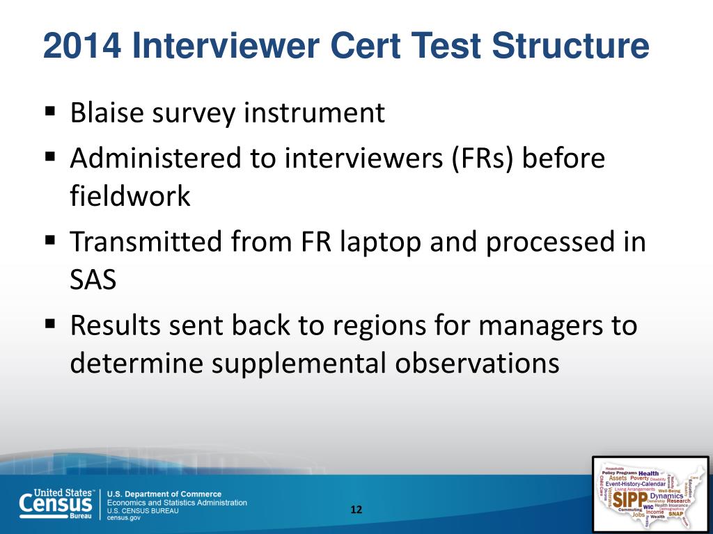 2014 Interviewer Cert Test Structure • Blaise survey instrument • Administered to interviewers (FRs) before fieldwork • Transmitted from FR laptop and processed in SAS • Results sent back to regions for managers to determine supplemental observations