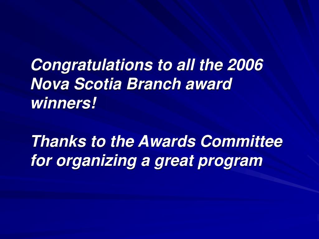 Congratulations to all the 2006 Nova Scotia Branch award winners! Thanks to the Awards Committee for organizing a great program