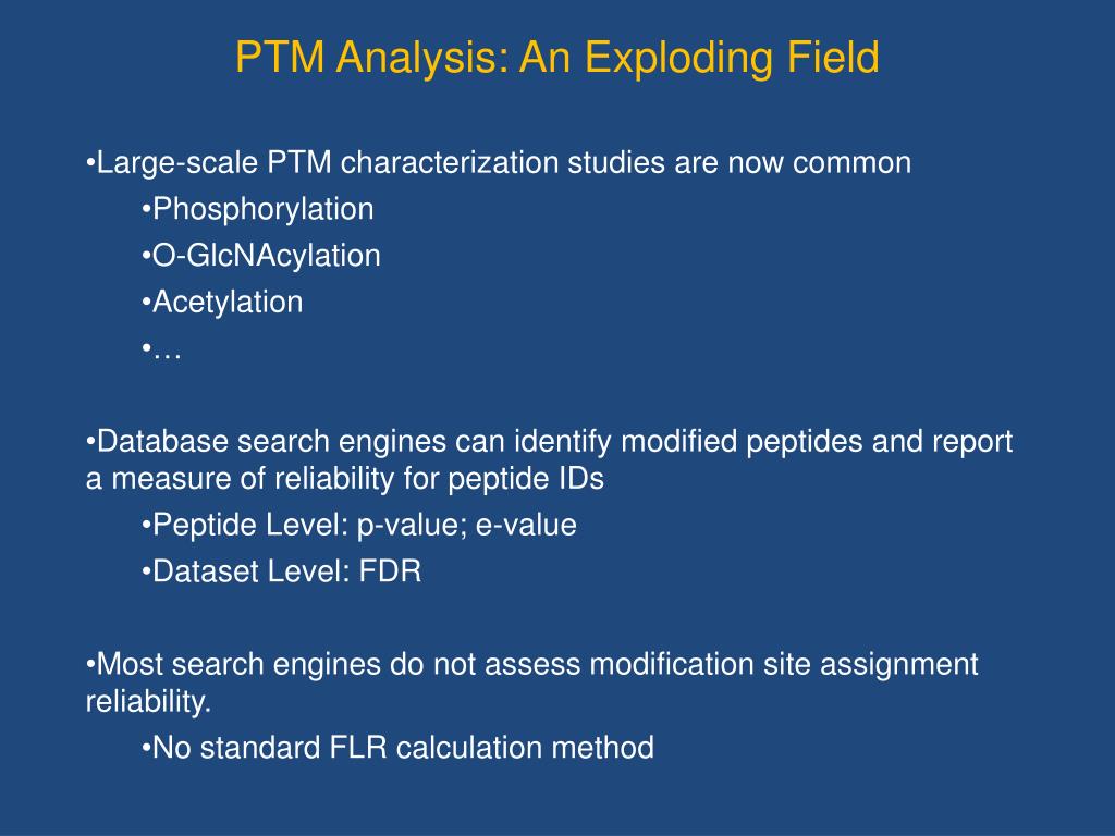 PTM Analysis: An Exploding Field • Large-scale PTM characterization studies are now common • Phosphorylation • O-GlcNAcylation • Acetylation • … • Database search engines can identify modified peptides and report a measure of reliability for peptide IDs • Peptide Level: p-value; e-value • Dataset Level: FDR • Most search engines do not assess modification site assignment reliability. • No standard FLR calculation method