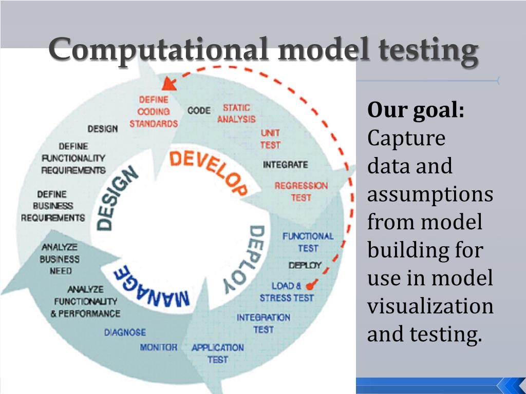 Computational model testing Our goal: Capture data and assumptions from model building for use in model visualization and testing.