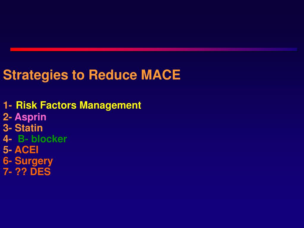 Strategies to Reduce MACE1-Risk Factors Management2- Asprin3- Statin4- B- blocker5- ACEI6- Surgery7- ?? DES