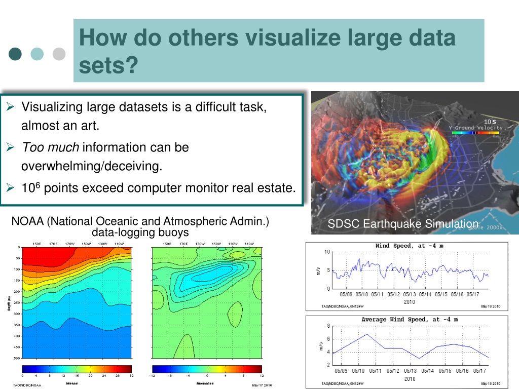 How do others visualize large data sets? SDSC Earthquake Simulation NOAA (National Oceanic and Atmospheric Admin.) data-logging buoys Visualizing large datasets is a difficult task, almost an art. Too much information can be overwhelming/deceiving. 106 points exceed computer monitor real estate.