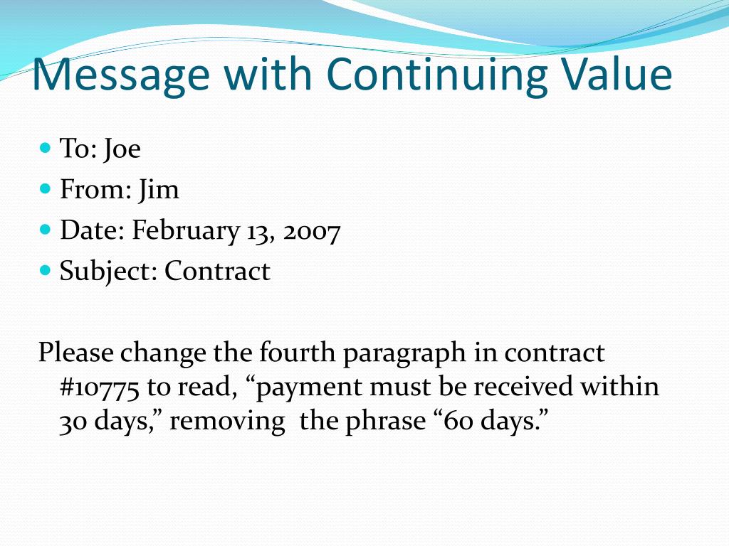 Message with Continuing Value • To: Joe • From: Jim • Date: February 13, 2007 • Subject: Contract Please change the fourth paragraph in contract #10775 to read, “payment must be received within 30 days,” removing the phrase “60 days.”