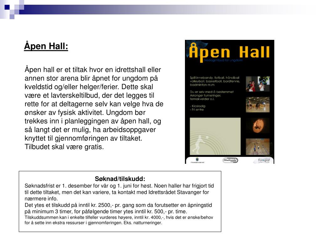 Åpen Hall: Åpen hall er et tiltak hvor en idrettshall eller annen stor arena blir åpnet for ungdom på kveldstid og/eller helger/ferier. Dette skal være et lavterskeltilbud, der det legges til rette for at deltagerne selv kan velge hva de ønsker av fysisk aktivitet. Ungdom bør trekkes inn i planleggingen av åpen hall, og så langt det er mulig, ha arbeidsoppgaver knyttet til gjennomføringen av tiltaket. Tilbudet skal være gratis. Søknad/tilskudd: Søknadsfrist er 1. desember for vår og 1. juni for høst. Noen haller har frigjort tid til dette tiltaket, men det kan variere, ta kontakt med Idrettsrådet Stavanger for nærmere info. Det ytes et tilskudd på inntil kr. 2500,- pr. gang som da forutsetter en åpningstid på minimum 3 timer, for påfølgende timer ytes inntil kr. 500,- pr. time. Tilskuddsummen kan i enkelte tilfeller vurderes høyere, inntil kr. 4000,-, hvis det er ønske/behov for å sette inn ekstra ressurser i gjennomføringen. Eks. natturneringer.