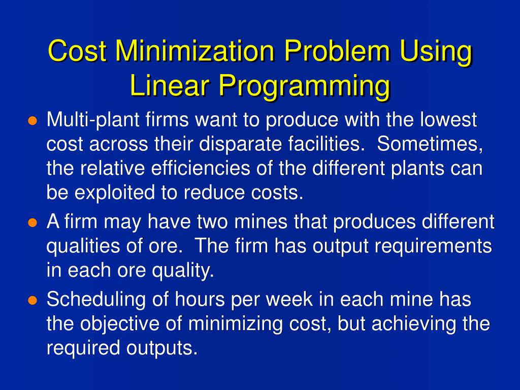 Cost Minimization Problem Using Linear Programming • Multi-plant firms want to produce with the lowest cost across their disparate facilities. Sometimes, the relative efficiencies of the different plants can be exploited to reduce costs. • A firm may have two mines that produces different qualities of ore. The firm has output requirements in each ore quality. • Scheduling of hours per week in each mine has the objective of minimizing cost, but achieving the required outputs.