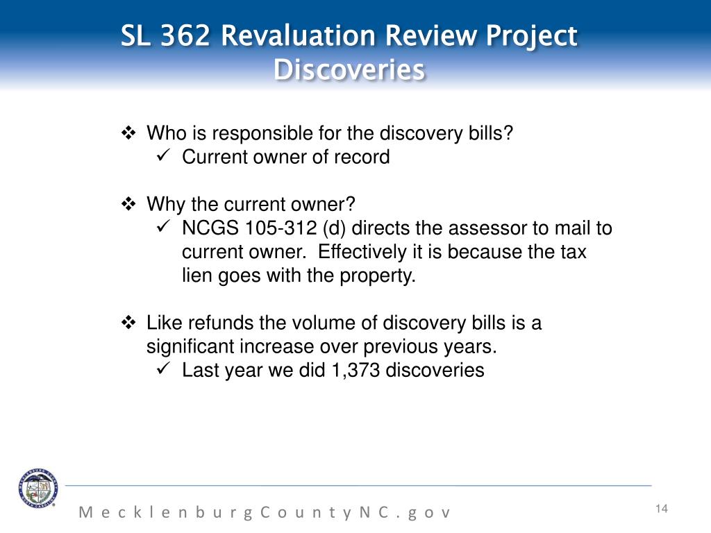 SL 362 Revaluation Review ProjectDiscoveries • Who is responsible for the discovery bills? • Current owner of record • Why the current owner? • NCGS 105-312 (d) directs the assessor to mail to current owner. Effectively it is because the tax lien goes with the property. • Like refunds the volume of discovery bills is a significant increase over previous years. • Last year we did 1,373 discoveries MecklenburgCountyNC.gov