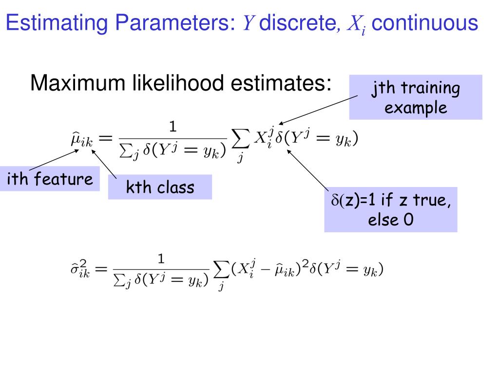 Estimating Parameters: Y discrete, Xi continuous Maximum likelihood estimates: jth training example ith feature kth class (z)=1 if z true, else 0