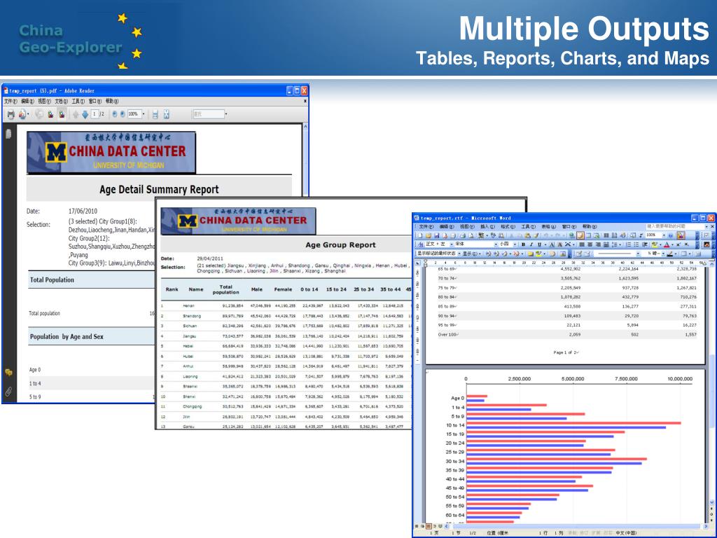 China Geo-Explorer China Geo-Explorer brought to you by China Data Center of the University of Michigan (UMCDC) and the State Key Laboratory for Information Engineering in Surveying, Mapping and Remote Sensing (LIESMARS) of Wuhan University for spatial data integration and analysis Statistical Data Census Data GIS Data