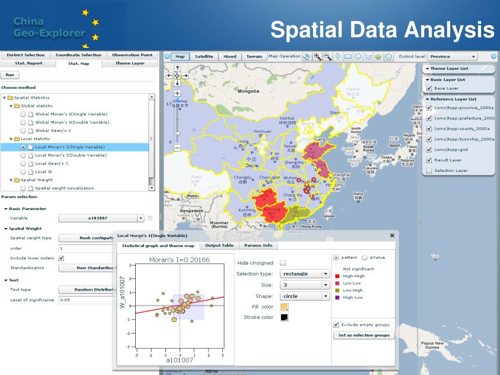 Functions Reports Time series Data Selection Data Service Spatial Analysis By administrative units (province, city, county, twp) Interactive Selection (circle, polygon, rectangle) By spatial regions (rectangle, circle, polygon, point) By locations (X & Y coordinates) Spatial Weight Creation By establishments Spatial Lag Extraction Spatial Autocorrelation (Moran/Geary C) Summary Report Comparison Report Rank Report Output (Word, Excel, PDF) Spatial Association (LISA, Local G) Thematic maps of equal interval LISA Cluster Map Maps Thematic maps of equal quintile LISA Significance Map Thematic maps of standard deviation Moran Scatter Plot Time series visualization Spatial-temporal data extraction