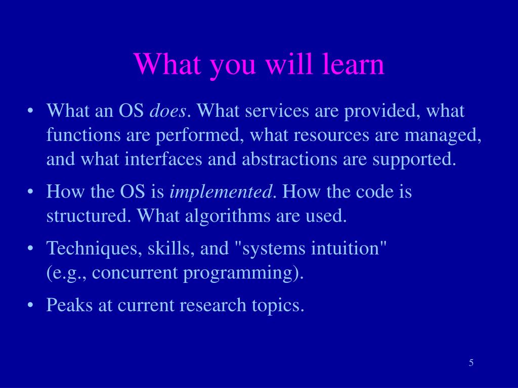 What you will learn • What an OS does. What services are provided, what functions are performed, what resources are managed, and what interfaces and abstractions are supported. • How the OS is implemented. How the code is structured. What algorithms are used. • Techniques, skills, and "systems intuition" (e.g., concurrent programming). • Peaks at current research topics.