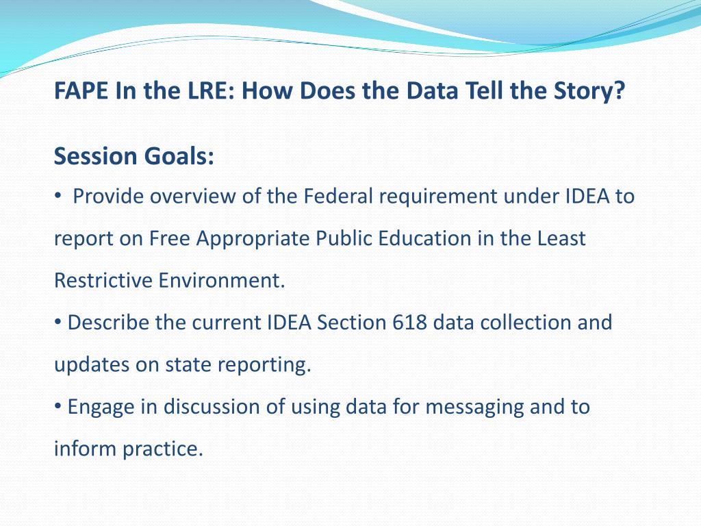FAPE In the LRE: How Does the Data Tell the Story? Session Goals: • Provide overview of the Federal requirement under IDEA to report on Free Appropriate Public Education in the Least Restrictive Environment. • Describe the current IDEA Section 618 data collection and updates on state reporting. • Engage in discussion of using data for messagingand to inform practice.